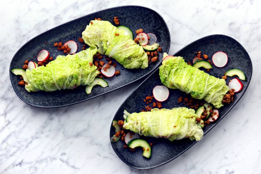 Breng een grote pan met water aan de kook. Haal 2 mooie bladeren per persoon van de kool en kook ze in delen in 2 minuten. Spoel met koud water, laat uitlekken en dep droog met keukenpapier