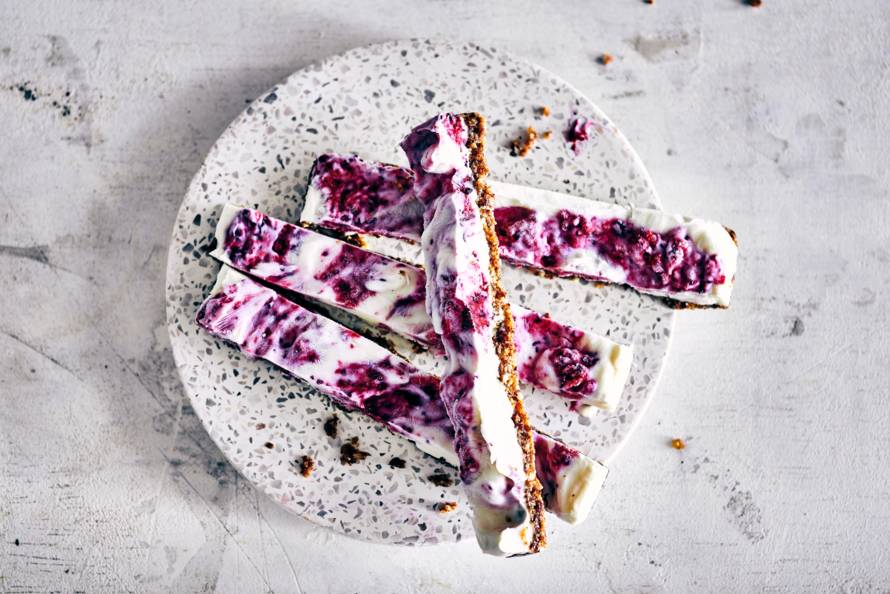 Roer de witte en paars-roze yoghurt door elkaar, maar roer niet te veel. Zo blijven beide kleuren zichtbaar. Verdeel het yoghurtmengsel over de notenbodem. Druk niet te veel aan, anders kan de notenbodem loslaten. Sluit het diepvriesbakje af met de deksel en laat in 3 uur hard worden in de vriezer.